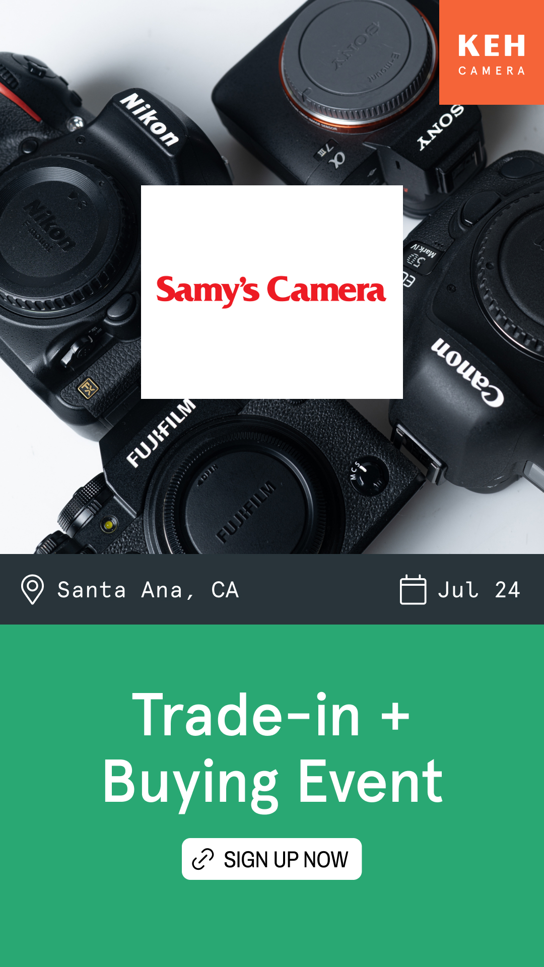 Join us Friday, July 24th, from 10am to 4pm, in Santa Ana, CA, for our in-store buying events. Have your photo and video gear appraised by a KEH Camera expert and get paid instantly.